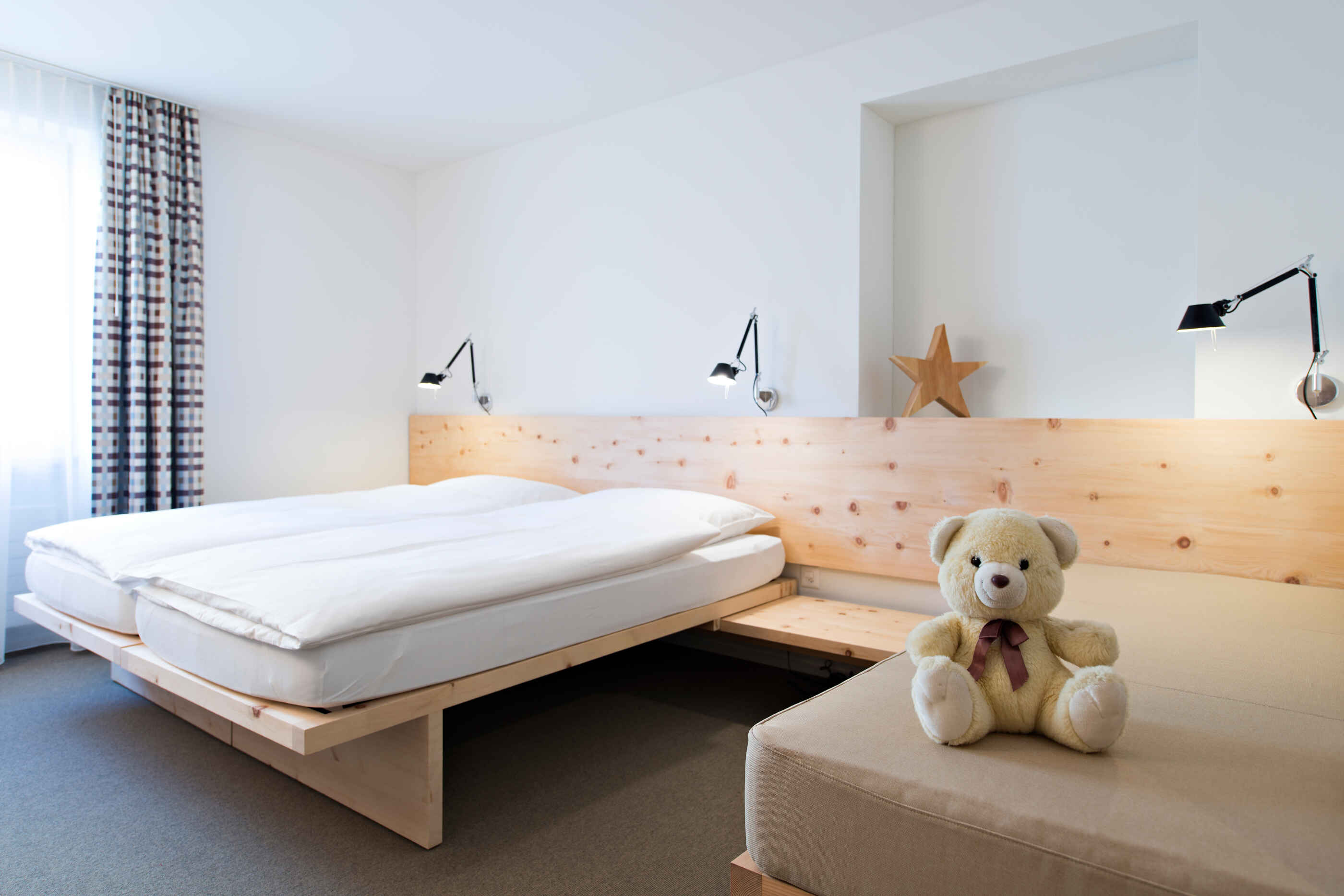 Die geräumigen Familienzimmer bieten viel Platz und Komfort und sind ideal für Familien mit Kindern oder kleine Gruppen und verfügen sie je nach Kategorie über drei separate Betten, ein Schlafsofa oder zwei Räume mit Verbindungstür – teils mit Balkon.