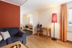 Das grosszügige Doppelzimmer überzeugt mit modernem Design, einem bequemen Sofa und herrlichem Ausblick auf den Dorfplatz und die Voralpen. Der private Balkon lädt zum Verweilen im Freien ein.